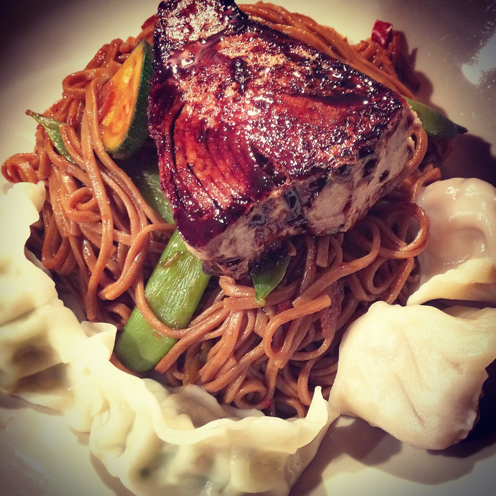 Delicious dinner this evening. I made stir fried Soba Noodles with a Teriyaki Yellowfin Tuna steak. Added a few dumplings on the side. Didn’t really need the dumplings to be honest but I really love them.*