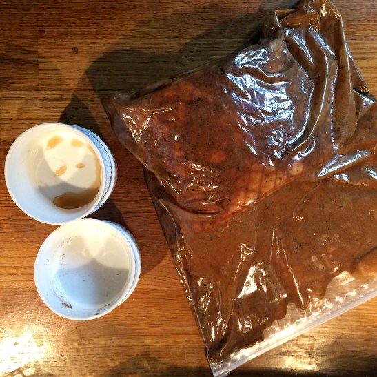 Mix all the ingredients to a paste – I needed to add a teaspoon of water just to make the paste a little looser. Smear all over the pork loin, making sure is gets everywhere. I score the surface fat a little to help the flavours soak in. Now place the pork and all the marinade into a ziplock bag, seal and massage thoroughly.