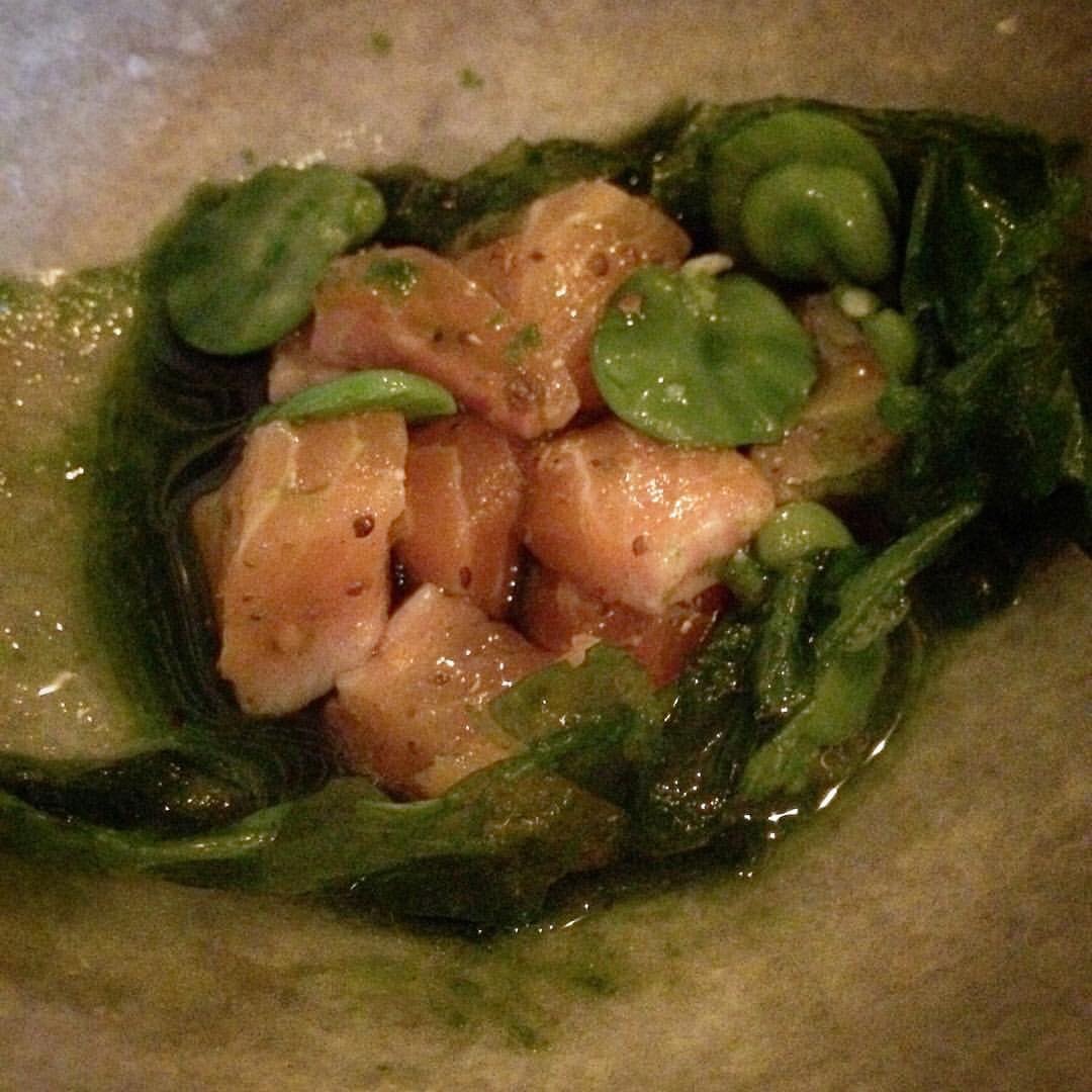Before the official 6 courses began, the chef sent over a little amuse bouche – a tasty little sourdough pizza with caramelised onion and goats cheese. They still have the same sourdough started they had when they opened the restaurant around 5 years ago and they look after it very carefully. Every night, all the embers from the fire pit are placed into the bread oven. This in the morning leaves the oven at the perfect temperature to cook the bread.